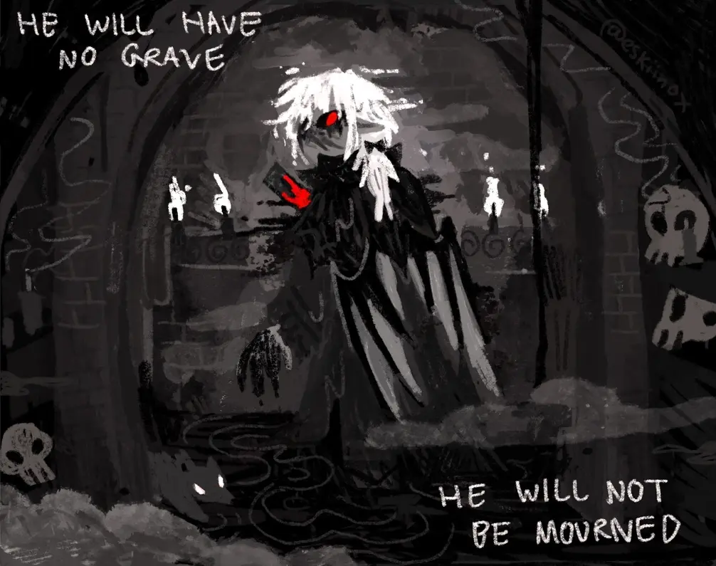 "The tale of Jack Von Pyroscythe was an unfortunate tragedy. He found no peace in life, vampirism, or death. He was preyed upon by unnatural forces beyond his comprehension, only to inflict the same pain onto others. He will have no grave. Nobody will mourn him."